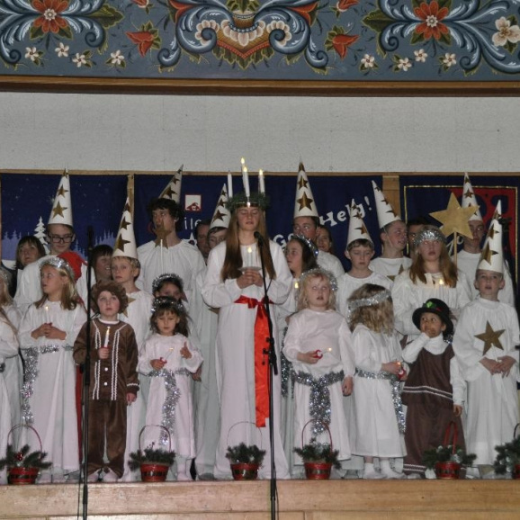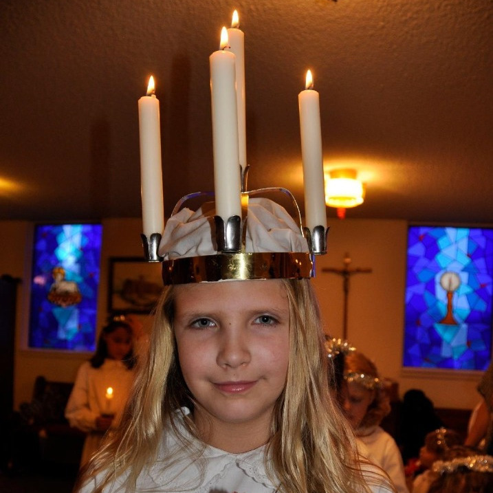 To help battle the darkness, a young girl, "Lucia" is chosen to wear a crown of light (candles) and lead a procession of children dressed in white robes. All of the children sing traditional songs. The evening typically includes saffron buns and other Swedish food. Learn more.